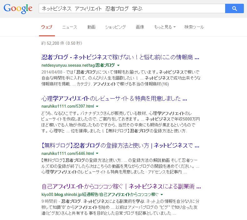「ネットビジネス アフィリエイト 忍者ブログ 学ぶ」で約52.200件まで絞り込んで